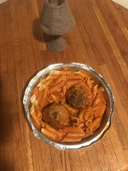 Nice looking tray...Penne Ala Vodka with Meatballs, presented in the original ’as delivered‘ tray.