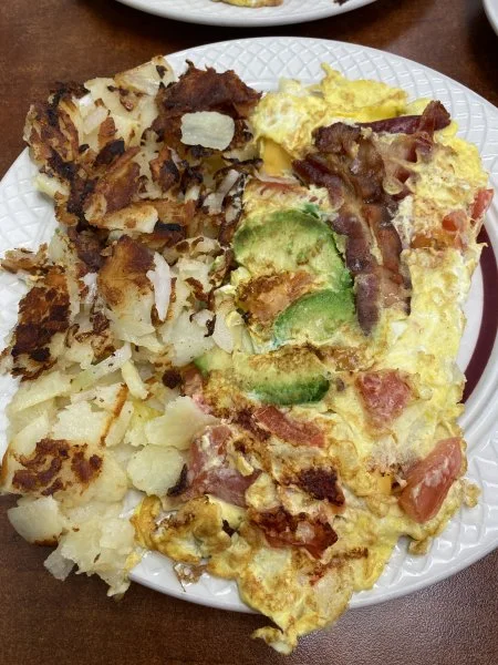 On the flip side, bacon, tomato, cheese, onion, avocado omelet and some potatoes.