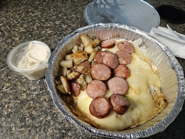 Polish Hungryman from Wendy's Deli in Mattituck. 3 eggs over easy, Swiss. Home fries, kielbasa and creamy horseradish