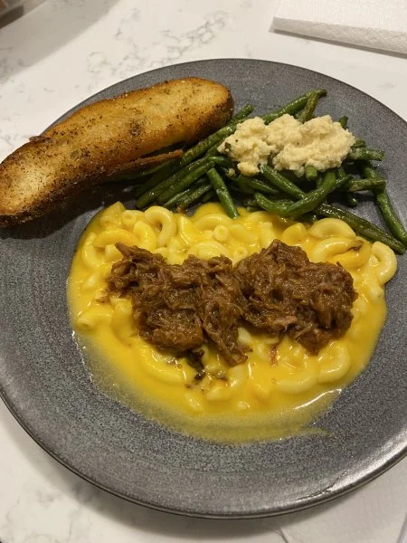 Mac and cheese , pulled pork, string beans with cauliflower mash, garlic bread.